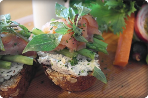 黑麵包搭配著醃燻鮭魚及蘆筍~~還有旁邊的一座生菜山!!!!