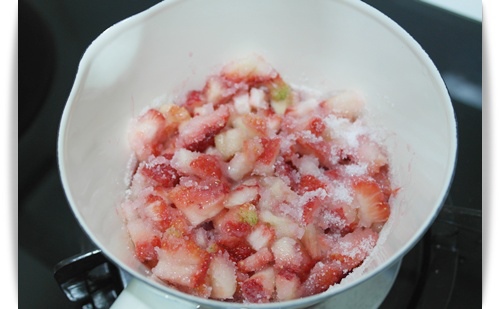 拿個小鍋將草莓丁倒入接著倒入砂糖!!