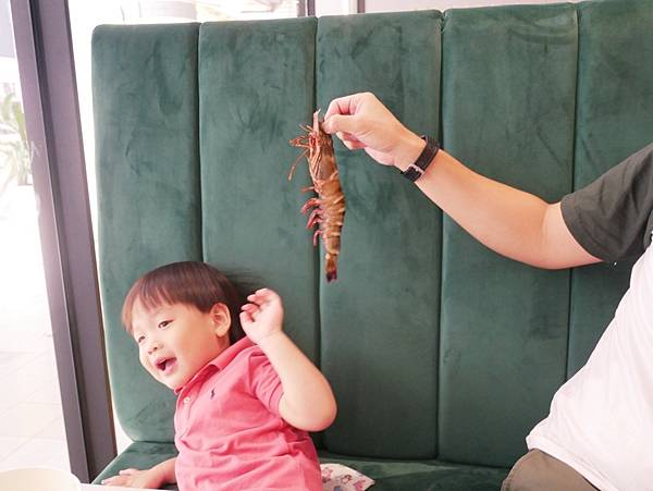 伍先生拿著手臂蝦鬧兒子(笑)