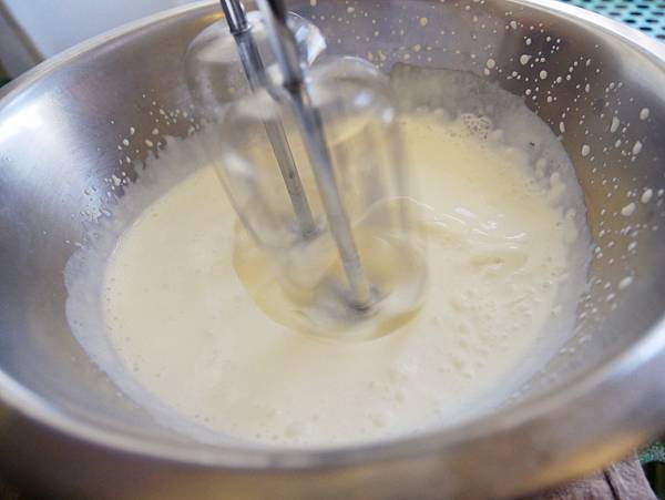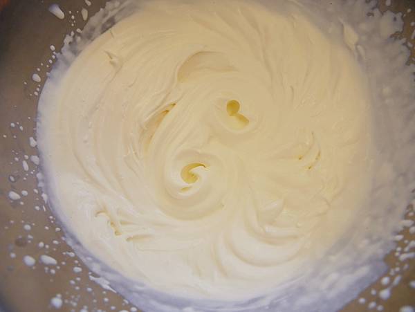 將冷藏的鮮奶油用電動打蛋器打發至9-10分。